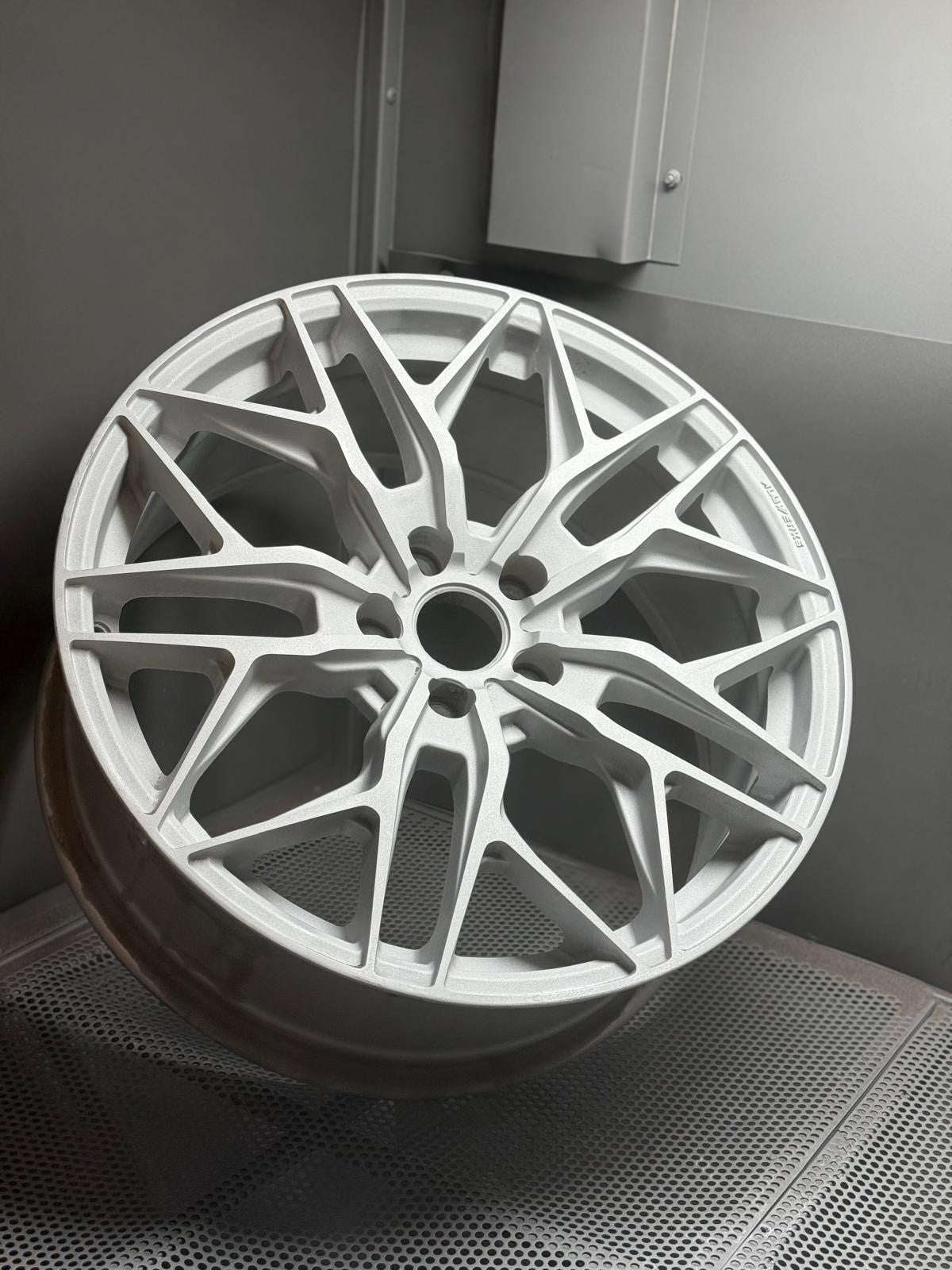 We inspect the wheel to determine if blasting is required before refinishing.